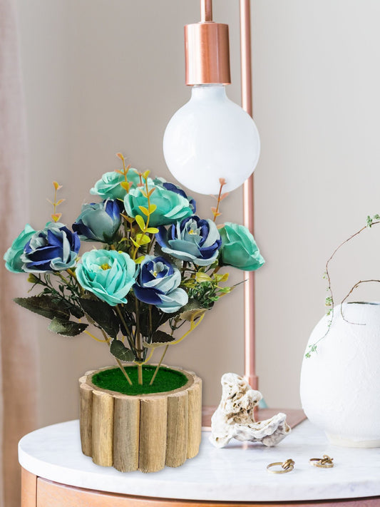 Artificial flowers with wooden pot for decoration for table top, home decor, office decor, rose flowers, artificial plant, craft, gift, combo, pack of 1 piece, Blue, 45 cm height