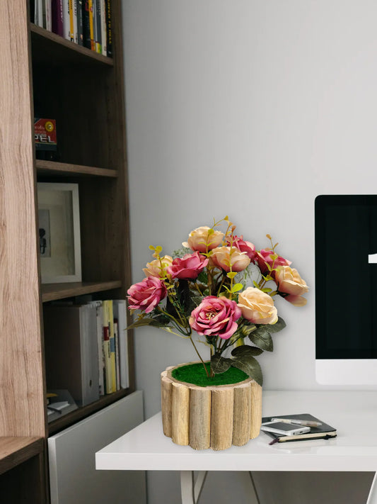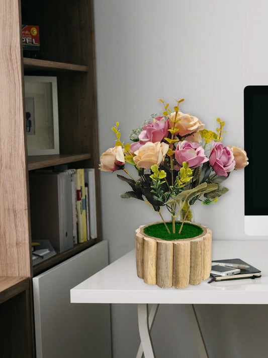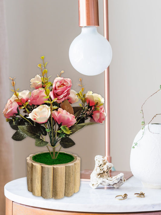 Artificial flowers with wooden pot for decoration for table top, home decor, office decor, rose flowers, artificial plant, craft, gift, combo, pack of 1 piece, Pink, 45 cm height