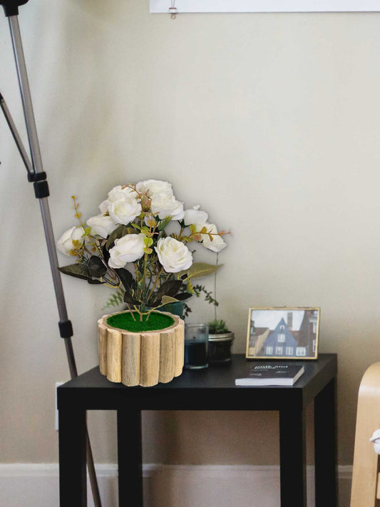 Artificial flowers with wooden pot for decoration for table top, home decor, office decor, rose flowers, artificial plant, craft, gift, combo, pack of 1 piece, White, 45 cm height