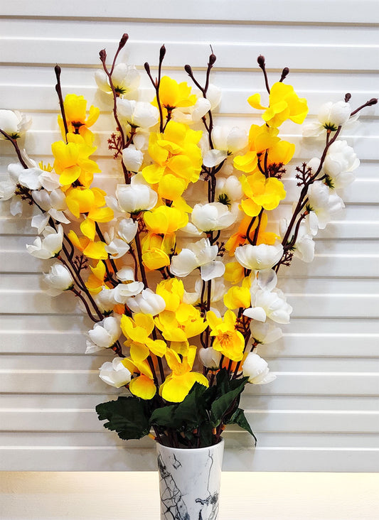 ARTSY® Serene White and Cheerful Yellow Artificial Cherry Blossom Flower Bunch For Home Decoration Vase Filler - One Piece, Without Vase 55 CM Long