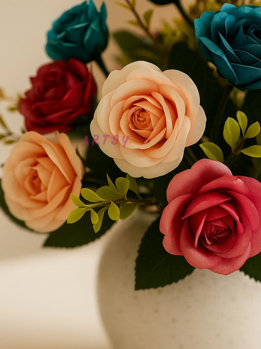 Pack of 4 Artificial Rose Flower Bunches – Assorted Colors, Realistic Decorative Stems